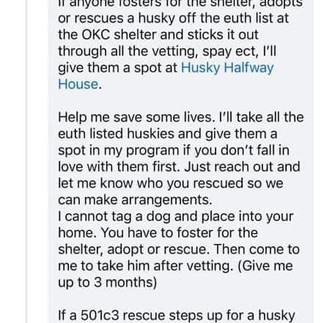 I have more than 200 huskies to take care of guys. Please help me out. I cannot take all the huskies that are gonna be die today.. help me please. The second picture is my offer for anybody who will foster for the shelter or go and adopt her. Let’s get this one safe because there are three more at other shelters that will die tomorrow as well.